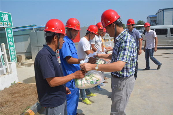 8月14日上午,開發(fā)公司副總裁劉建華帶隊來到園區(qū)派出所、夢家園、許莊變、2014年市政二標(biāo)、生產(chǎn)力中心等項目工地,現(xiàn)場慰問奮戰(zhàn)在高溫一線的企業(yè)員工和建筑工人,并親自給他們遞上了毛巾、肥皂、洗發(fā)水、清涼油等防暑降溫物品。