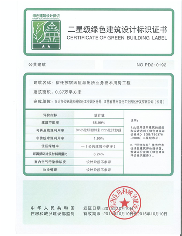 近日,由開發(fā)公司代建的蘇宿園區(qū)派出所業(yè)務(wù)技術(shù)用房工程,順利通過國家二星級(jí)綠色建筑設(shè)計(jì)標(biāo)識(shí)認(rèn)證。