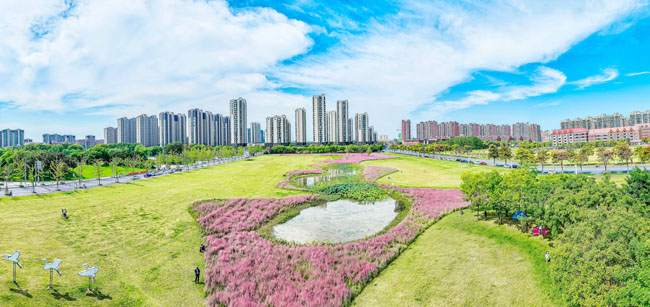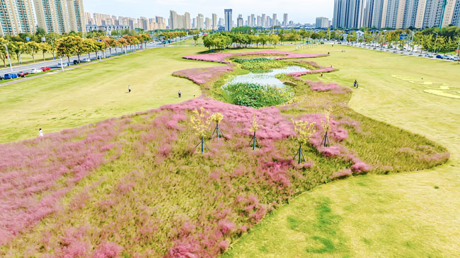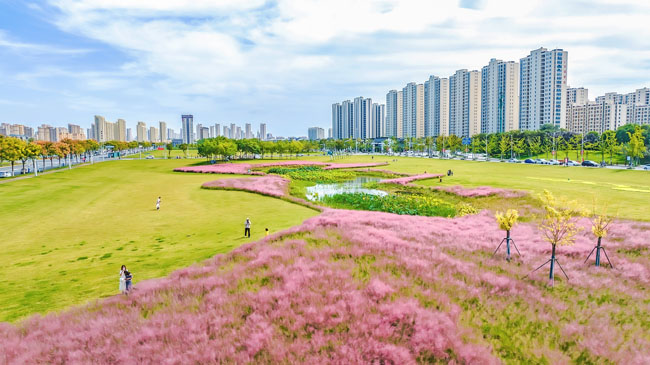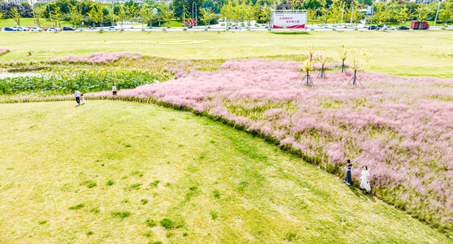 2023年10月1日,蘇宿工業(yè)園區(qū)蘇州公園北側(cè)綠地的粉黛亂子草盛開了,一片片粉色花海如夢(mèng)似幻,吸引游人前來觀賞,樂享國(guó)慶假期。