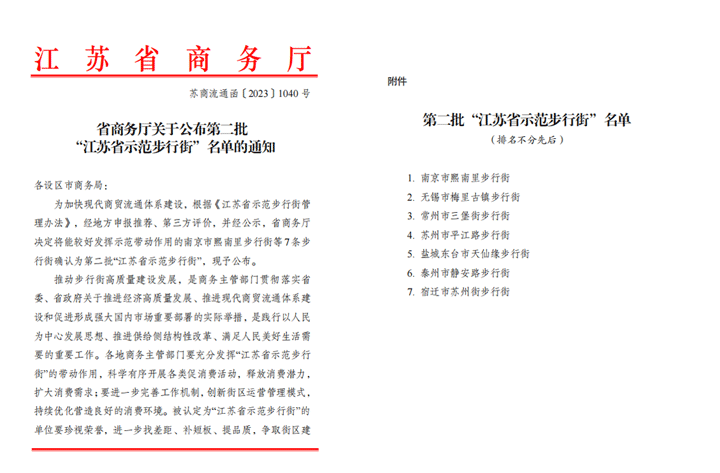 此次評(píng)定工作是根據(jù)《江蘇省示范步行街管理辦法》,由江蘇省商務(wù)廳集中組織第三方專家和評(píng)審員驗(yàn)收,先后經(jīng)過上報(bào)資料、專家審核、實(shí)地考察、全省評(píng)比等方式確定7條江蘇省示范街區(qū)步行街。