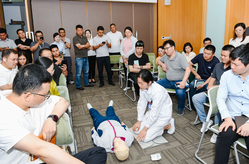 在第一階段活動現(xiàn)場,醫(yī)護人員通過PPT的形式,為大家詳細講解了心肺復蘇、AED使用、海姆立克急救法的操作要點和注意事項,以及夏季高溫中暑的自救互救應(yīng)急處理知識,并通過互動方式一對一指導教學,鍛煉了實際操作能力。隨后,醫(yī)護人員也為在場職工進行血壓、血糖等項目測量,中醫(yī)把脈問診、家庭醫(yī)生簽約等便民服務(wù),參加此次活動的職工紛紛表示受益匪淺。