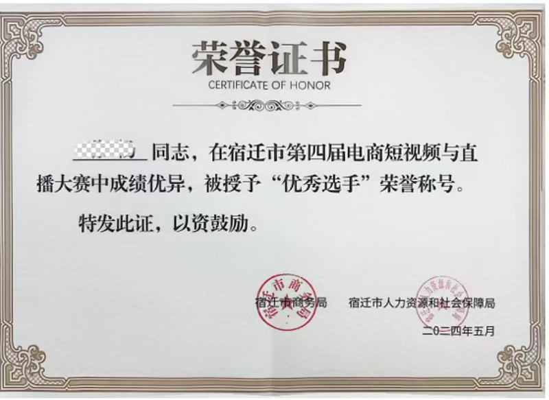 榮譽(yù)證書得獲得不僅是對(duì)參賽選手個(gè)人努力和才華的認(rèn)可,也是對(duì)蘇宿電商園在電商領(lǐng)域?qū)I(yè)人才培養(yǎng)和推動(dòng)電商直播行業(yè)發(fā)展的成果的肯定。