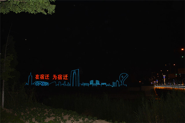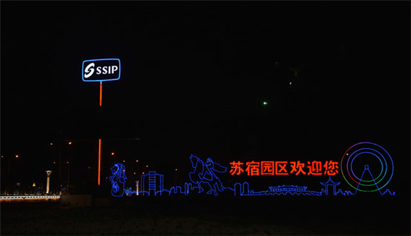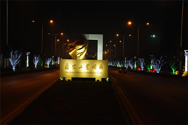 在園區(qū)東入口為民河的一畔,一座座生動(dòng)的城市剪影燈光造型在青海湖西路兩側(cè)一字排開(kāi)。有象征著新加坡元素的“魚(yú)尾獅”,有蘇州工業(yè)園區(qū)金雞湖畔的東方之門、摩天輪和李公堤,還有西楚霸王項(xiàng)羽騎馬的颯爽英姿。造型以蘇州、宿遷和新加坡城市建筑輪廓線、城市主題雕塑為基本元素,以剪影形式為載體,以現(xiàn)代高科技LED燈光為表現(xiàn)手段,通過(guò)炫麗動(dòng)感的光影效果,在夜色中描繪出了一副靚麗多姿的畫(huà)卷,生動(dòng)地展現(xiàn)出了園區(qū)“從新加坡到蘇州再到宿遷”和“在宿遷、為宿遷”的發(fā)展理念。