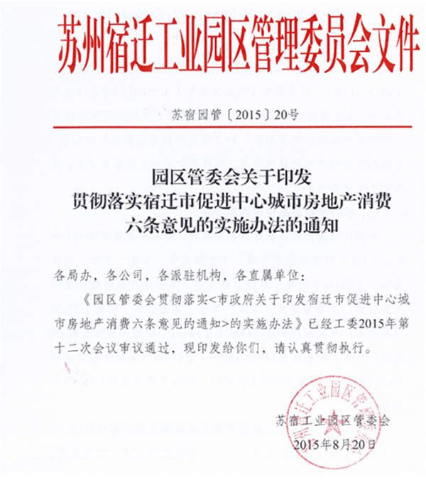 8月20日,在市政府出臺(tái)《宿遷市促進(jìn)中心城市房地產(chǎn)消費(fèi)六條意見(jiàn)》之后的第三天,園區(qū)率先出臺(tái)了《園區(qū)管委會(huì)貫徹落實(shí)<市政府關(guān)于印發(fā)宿遷市促進(jìn)中心城市房地產(chǎn)消費(fèi)六條意見(jiàn)的通知>的實(shí)施辦法》。