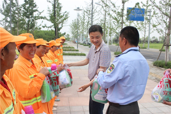 6月29日上午,園區(qū)黨工委委員、管委會副主任、規(guī)劃建設局局長許紹杰帶隊,親切慰問了奮戰(zhàn)在一線的城市維護作業(yè)人員,給他們送去了夏日里的問候和黨的關懷,感謝他們?yōu)閳@區(qū)的整潔、優(yōu)美城市環(huán)境所作出的貢獻。