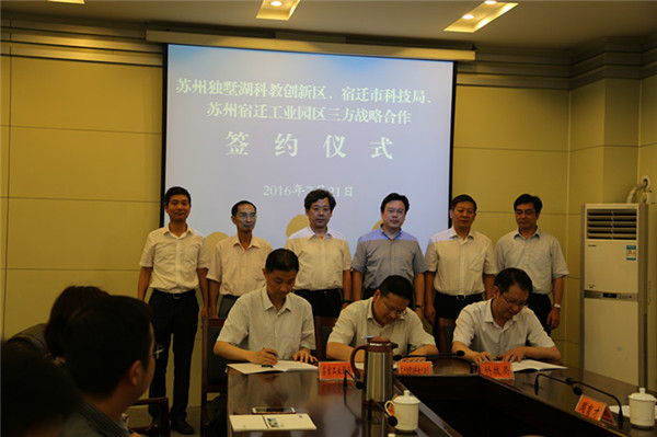 7月21日下午,蘇州獨墅湖科教創(chuàng)新區(qū)管委會、宿遷市科學技術(shù)局、蘇州宿遷工業(yè)園區(qū)管委會三方戰(zhàn)略合作協(xié)議簽約儀式在宿遷舉行。根據(jù)協(xié)議,三方將在科技資源轉(zhuǎn)移、科技平臺建設(shè)以及科技環(huán)境優(yōu)化等方面推進合作。這是蘇宿兩地合作內(nèi)涵逐步深化、合作領(lǐng)域不斷拓寬、合作水平全面提升的重要體現(xiàn),更是深入貫徹落實省委、省政府部署的重要舉措。市委副書記、市長王天琦,副市長、蘇宿工業(yè)園區(qū)黨工委書記、管委會主任方文浜,市政府秘書長章其波見證簽約。